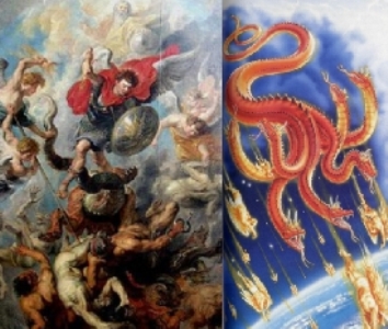 Apo.12:7 Houve então uma guerra nos céus. Miguel e seus anjos lutaram contra o dragão, e o dragão e os seus anjos revidaram. 8 Mas estes não foram suficientemente fortes, e assim perderam o seu lugar nos céus. 9 O grande dragão foi lançado fora. Ele é a antiga serpente chamada Diabo ou Satanás, que engana o mundo todo. Ele e os seus anjos foram lançados à terra.