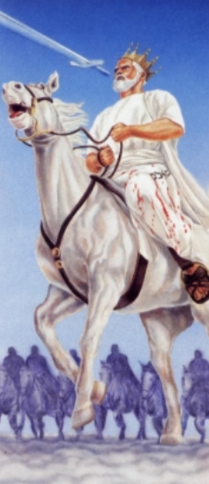 Agora, João vê um cavalo branco vindo do céu. O cavaleiro luta com justiça. Ele está vestido com uma túnica manchada de sangue, e o seu nome é Palavra de Deus. Exércitos de guerra o seguem vestidos de branco.