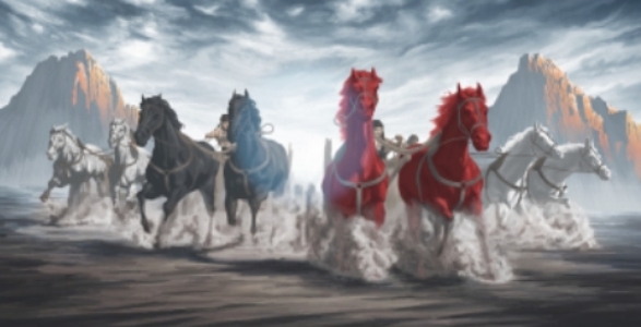 Temos quase a mesma imagem dos cavaleiros apocalípticos no capítulo seis do Apocalipse, ou seja, um cavalo branco, um vermelho, um preto e um malhado, que pode ser equiparado a um cavalo pálido. Quem são esses cavalos é explicado por um anjo em Zacarias, capítulo 6:4-5.