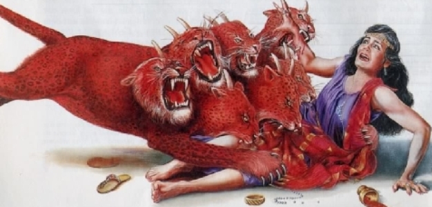 Apo.17:3 Então o anjo me levou no Espírito para um deserto. Ali vi uma mulher montada numa besta vermelha, que estava coberta de nomes blasfemos e que tinha sete cabeças e dez chifres. 4 A mulher estava vestida de púrpura e vermelho e adornada de ouro, pedras preciosas e pérolas. Segurava um cálice de ouro, cheio de coisas repugnantes e da impureza da sua prostituição. 5 Em sua testa havia esta inscrição: MISTÉRIO: BABILÔNIA, A GRANDE; A MÃE DAS PROSTITUTAS E DAS PRÁTICAS REPUGNANTES DA TERRA. 6 Vi que a mulher estava embriagada com o sangue dos santos, o sangue das testemunhas de Jesus. Quando a vi, fiquei muito admirado. 7 Então o anjo me disse: “Por que você está admirado? Eu explicarei o mistério dessa mulher e da besta sobre a qual ela está montada, que tem sete cabeças e dez chifres.